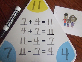 Vous trouverez l’atelier prêt >ici< chez First grade School Box. Le blog est en anglais mais l’atelier est utilisable tel quel. Le téléchargement se trouve en bas de page. Vous trouverez les cartes chiffres (Fact family_set), le triangle (Fact Family Triangle) et les maisons qui servent de correction (Fact family house).